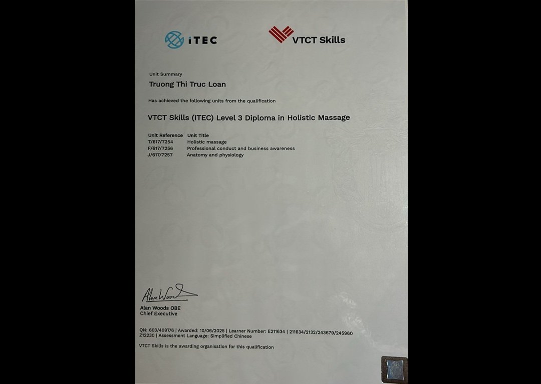 - Diploma in Holistic Massage (ITEC, United Kingdom / 英国)